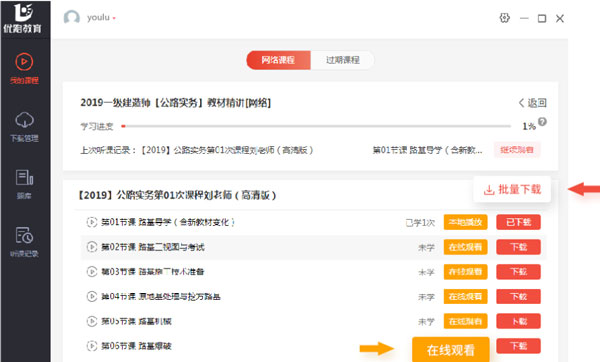 5、课程页面选择要观看的课程,点击【在线观看】进入播放页面;点击【下载】或【批量下载】课程,下载课程可以离线观看;