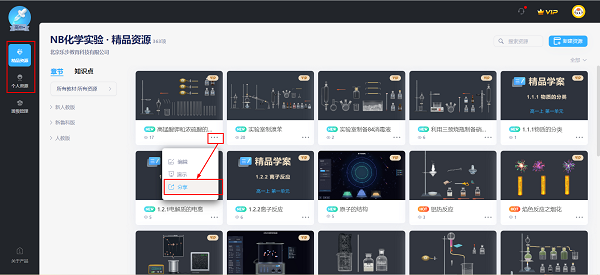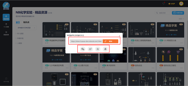 在精品资源页(或个人资源页),点击实验【菜单】按钮 > 点击【分享】,在弹出窗口中可复制分享链接,发送给学生,即可分享当前实验;也可以直接点击下方图标,分享到社交应用中。