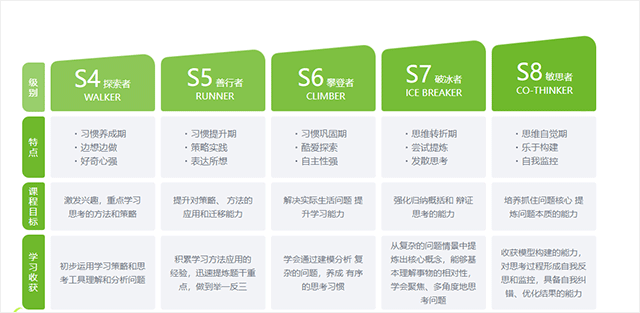 豌豆思维基于儿童认知心理学以及数学思维的发展阶段,为3-8岁的孩子搭建了6 Steps 成长体系。6 Steps 成长体系适合于不同级次的幼儿园和小学1-2年级学员,并为每一个不同阶级的学员制定不同的思维目标,科学分级、层层递进,记录孩子数学思维的成长轨迹。