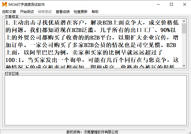 MOA打字速度测试软件官方版是一款非常实用的打字练习测试软件,能够帮助用户真实地反映出自己的打字速度,除了个人用户,这款软件也适用于公司对新招聘的员工进行打字速度评测,公司可以通过使用MOA打字速度测试软件,快速了解员工的打字水平是否符合标准。