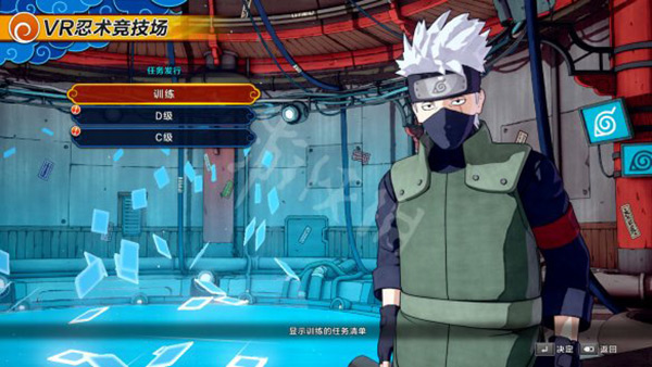 VR忍术竞技场是集结了木叶忍者村全力打造的最先端科学设施。目前作为修练场,也特别开放给忍界联赛的参加者使用,能用[VR装置]创造的虚拟空间,进行战斗模拟的[VR任务],通过完成各种VR任务,从而提升[忍者阶级],随着忍者阶级的提升,在忍者屋内可购买的装备也能够得到升级。在「VR忍术竞技场」中,又可分为三种任务模式,单人任务,共斗任务(募集)与共斗任务(参加)。在单人任务之中,除了最为基础的教程任务,即训练任务外,还将解锁不同级别的游戏任务。