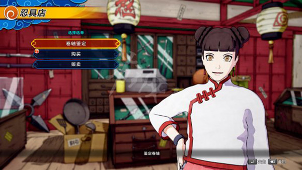 木叶忍者村的忍具屋,店主为木叶的天天,能够获得武器,服装,装饰品等各式各样道具的商店,并且还可以鉴定平时我们在VR任务或忍界联赛对战中获得的卷轴,通过鉴定卷轴,从而来获得一些游戏道具。