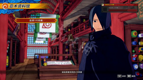 馆长由佐助担任,忍术资料馆,保存着传说的忍者大师战斗的纪录,而VR装置会以那份资料来重现虚拟的忍者大师,即忍者师傅,成为VR师傅的弟子,从而来继承招式,成功拜到VR师傅之后,在我们进行任务时,VR师傅会对我们进行辅助。且在之后的一些对战或者VR任务重获得[修炼点数],而不断积累的修炼点数,能够解锁游戏内的新忍术与道具。