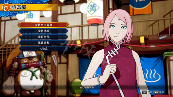 旅笼屋的店长是小樱,通过旅笼屋,能够自定化自身的装备,包括人物的外观,武器,忍术,决定战斗风格的型态,出击装备最多只能够登入4个不同的战斗型态,通过在小樱的旅笼屋内对战斗型态的调整,能够在之后的某些战斗中进行更换使用,同时你购买游戏时赠送的,早期开放权 培因,鸣人风格2nd,新忍出击外套 白与黑,自来也风格 仙:上也将在旅笼屋的追加内容内获得。