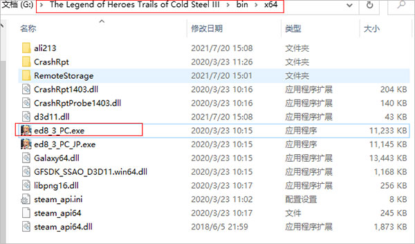 4、汉化之后我们找到如图所示的目录找到闪之轨迹3中文版下的ed8_3_pc.exe双击打开