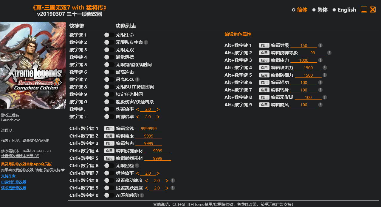 真三国无双7猛将传修改器风灵月影版功能如下: