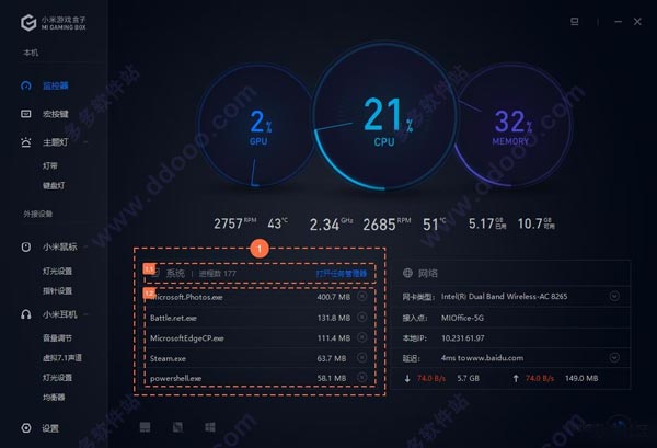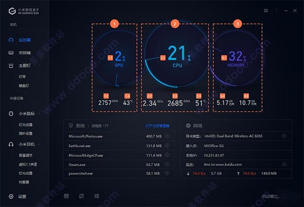 通过清晰的仪表盘,您可以看到笔记本GPU、CPU、内存的使用情况与运行情况,一目了然。