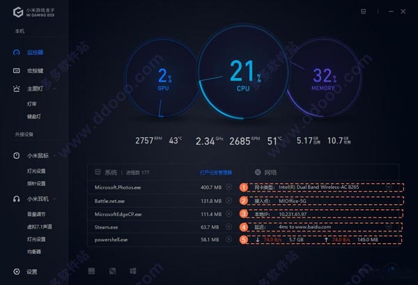 小米游戏盒子是预装在小米游戏本中的一款控制软件,其本质上就是一款RGB灯设置软件+宏按键设置软件,旨在帮助轻松掌控笔记本的运行状态,提升游戏体验。软件主要包含系统监控、功能设置和外设产品控制三部分,其中系统监控可以实时查看笔记本的系统状态;功能设置可以自定义宏按键以及笔记本灯效;外设产品控制可以管理接入笔记本的外设软件。不过需要注意的是:安装小米游戏盒子时,一定要先安装软件包中的小米游戏盒子基础服务,否则可能无法运行。