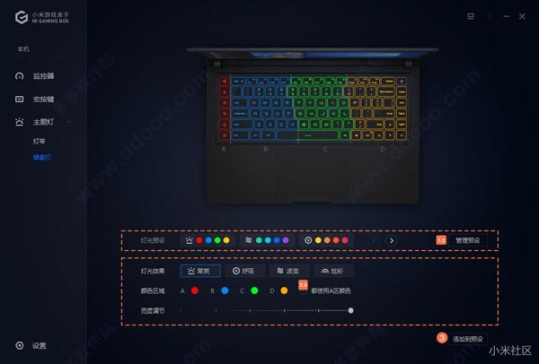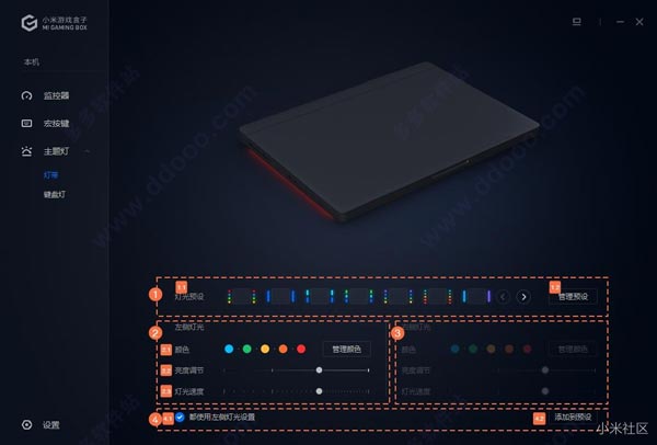您可以选择我们为您预设的灯光效果,也可以自行设置氛围灯的亮度、呼吸速度等,以获得您喜爱的灯光效果。