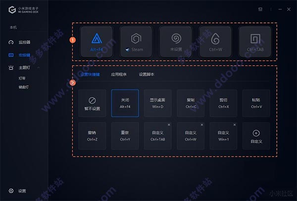 在这里,您可以针对小米游戏本键盘左侧的5个宏按键进行设置,定义您希望用到的功能。设置的范围包含快捷键、应用程序、脚本,当您绑定按键后,您点击对应的实体按键,程序将为您执行对应的操作。如果您不不希望绑定按键,可以选择暂不不设置。