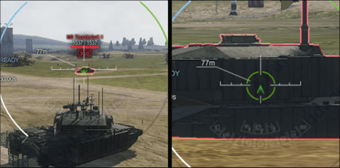 当准星显示绿色的时候,表示当前使用的炮弹,可以击穿目标。