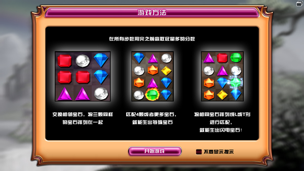 Avalanche:开始时界面上会有一些宝石,每移动一步顶部会落下5枚宝石。在整个界面被填满之前消除80枚宝石。