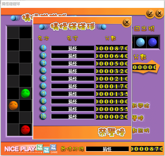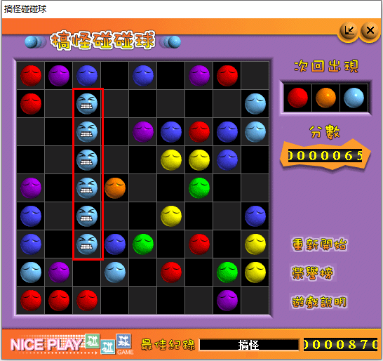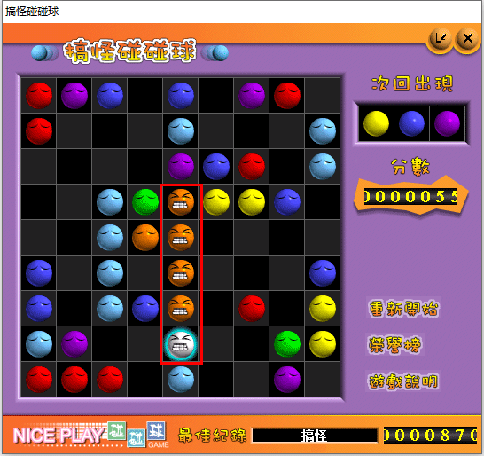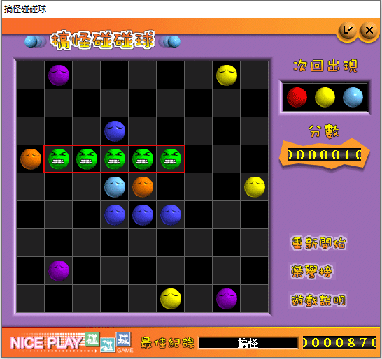 1、搞怪碰碰球游戏规则:游戏区为9×9区域大小,开局随机放入5个新球。球可以在通路区域任意移动,5球或5球以上同色球连成直(斜)线即可消除。若移动而未能消除球,则随机加入3个新球。每次加入新球后,都会预先提示下一次将加入的3个新球球色。