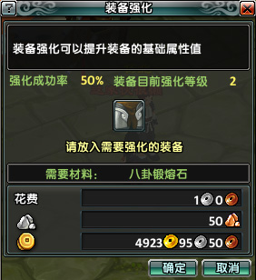 1、将需要强化的装备放入相应的位置,点击确定,即可进行装备强化