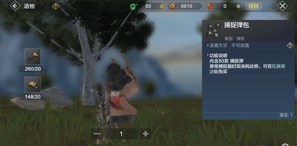 点击捕捉弹包即可进入制作页面,制作一个捕捉弹包需要20木头、20石头,内含50发捕捉弹,木头和石头可以在伐木和采矿中获取,根据自己所需求的数量来制作捕捉弹包,最后如果不想制作可以直接在氏族商店购买。