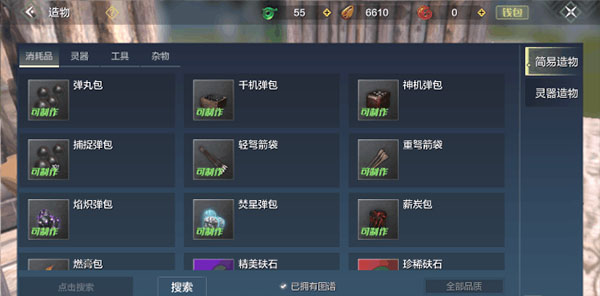 合成功能可以合成消耗品、灵气、工具、杂物等类型的道具,捕捉器子弹是消耗品,以捕捉弹包为一组,所以在消耗品菜单中找到并点击捕捉弹包就可以打开制作面板,同时其他弹包、箭袋也可以在消耗品栏找到并制作。