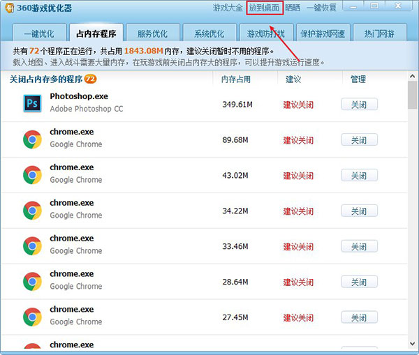 如果我们怕找不到,我们可以点击上方的按钮把游戏优化器放到桌面;