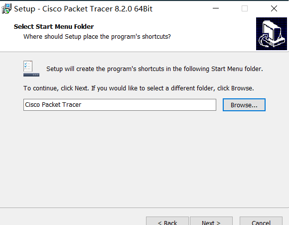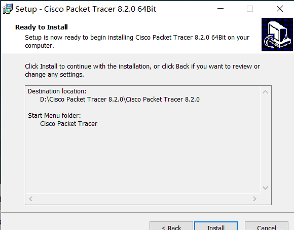 这一步是选择安装路径,默认是在 "C:\Program Files\Cisco Packet Tracer 8.2.0" 目录下。我的是C盘没有很多的空间就选择安装在D盘,在此处可以根据自己的实际情况进行选择安装路径 (安装路径要记住,后面破解登录页面还需要使用),然后下一步。
