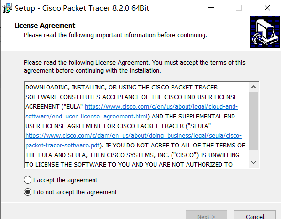 先运行思科模拟器的 Setup.exe 文件。这里以Windows 10 x64为例:双击Cisco PacketTracer-v8.2.0-Win64-Setup.exe文件进入安装引导界面