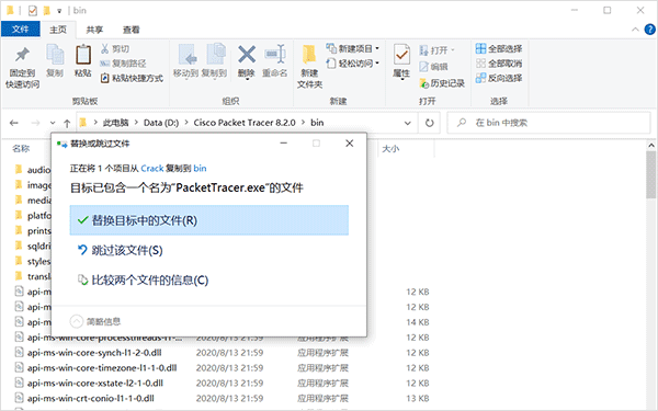 在我分享的文件夹内找到 "Creck" 文件夹下的 "PacketTracer.exe",然后复制粘贴到自己刚刚的安装路径下面的 "/bin/" 目录下。