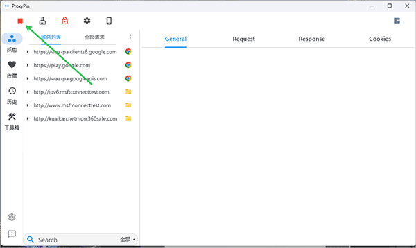1、首先说明的是用户不管是普通的http抓包,还是https抓包都是可以直接打开软件后就会自动进行抓包操作,如果要终止操作可以点击顶部的红色运行按钮