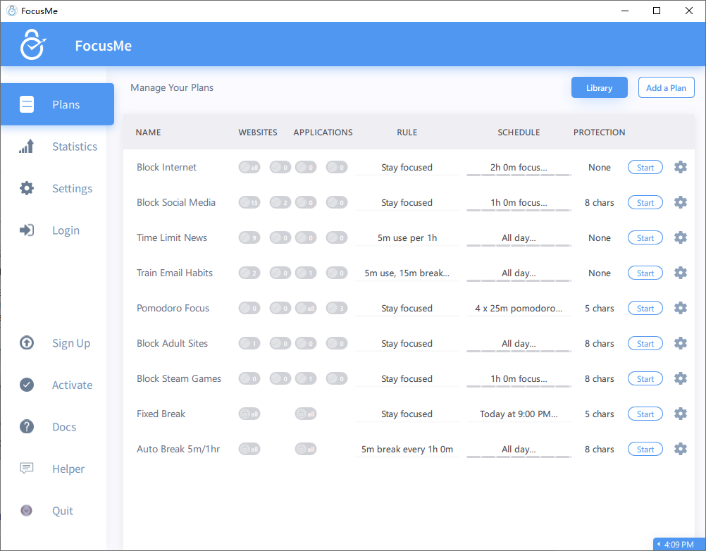 FocusMe是一款简单易用的网站拦截器,它可以帮助您专注于重要的内容,并阻止您被社交媒体,新闻,游戏或收件箱分散注意力,支持固定时间设置,限定上网时间,帮助你更好的专注于同一件事,提高你的工作效率。除此之外,FocusMe还改进带了黑名单、白名单、时间追踪器、休息提醒、强制模式、密码保护等等功能,是一款非常适用于Windows、Mac和Android多平台的应用程序,而且操作简单又实用,有需要的朋友欢迎免费下载体验!