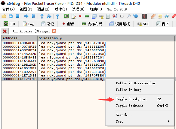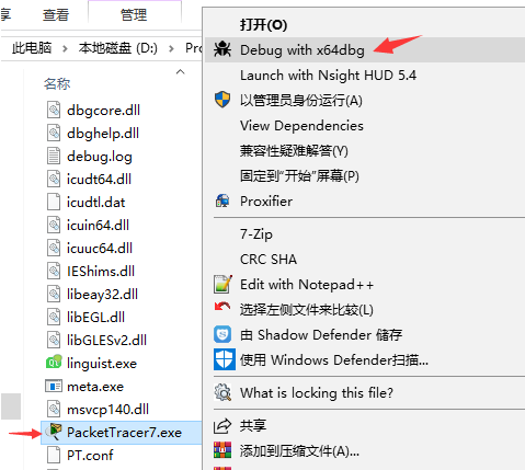 1、在x64dbg官网下载完成后,点击Packet Tracer7.0,用x64dbg打开;