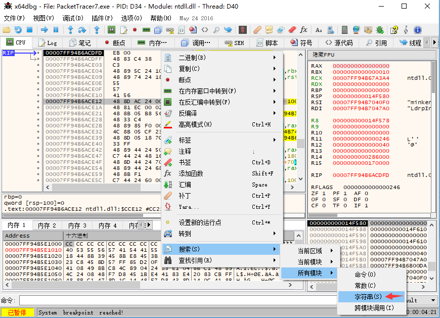 2、在任意空白位置右键-->搜索-->所有模块-->字符串;