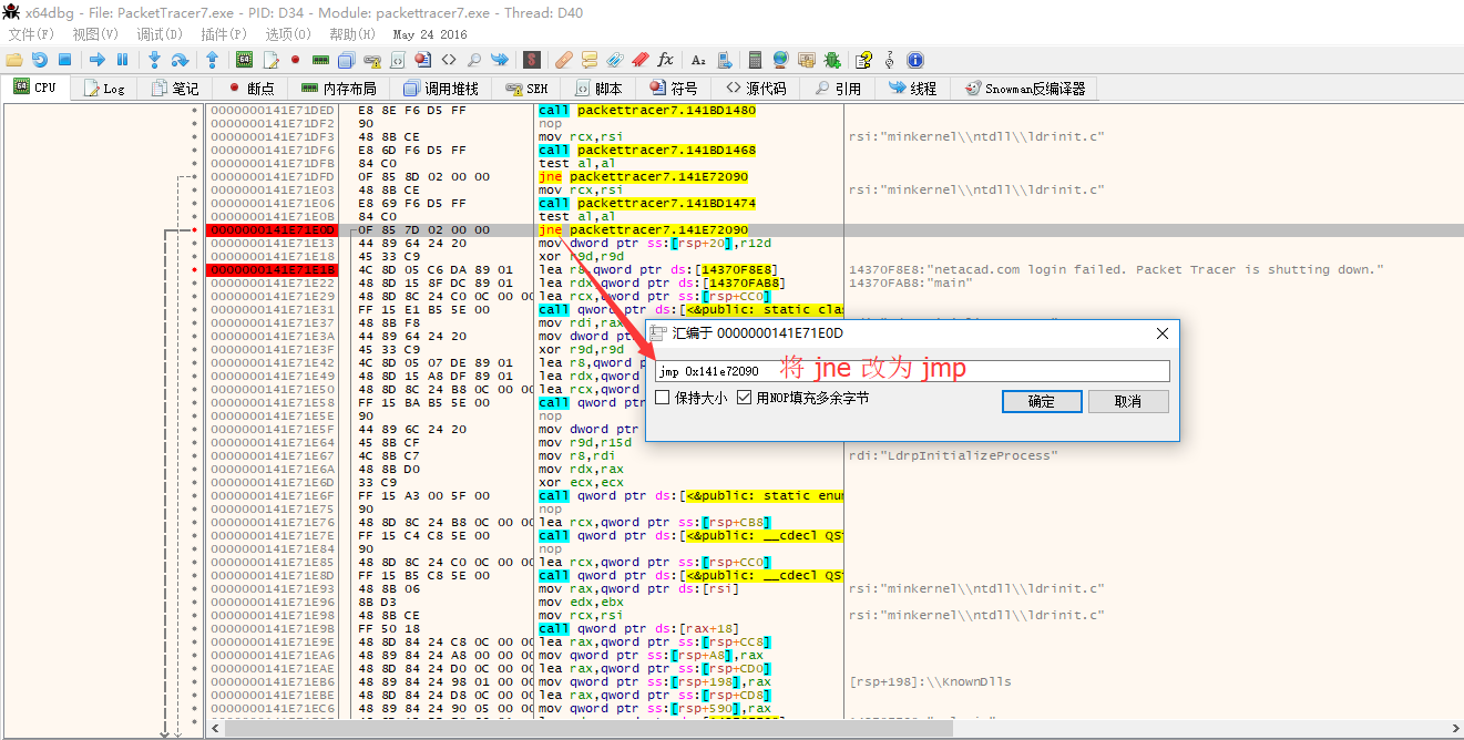 7、选择如图的段首,双击两个jne所在的位置,将jne修改为jmp,点击确定,然后再后续弹出的窗口点击取消;