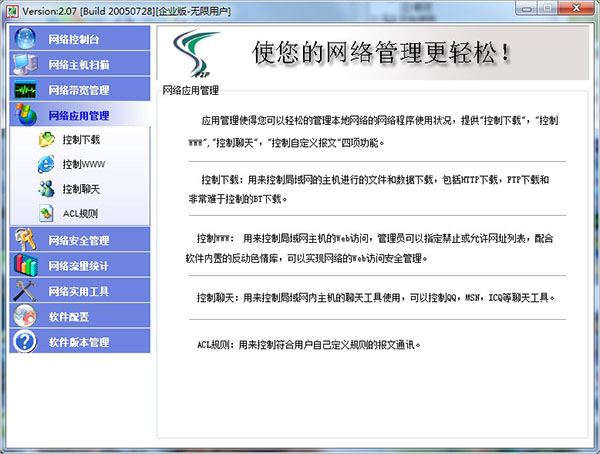 1、可以控制每一台机器的上传,下载的速度,还可以对通常的聊天软件进行限制。