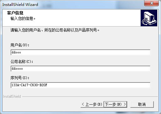 3、设置公司名、用户名,以及输入序列号133A-CA17-C630-B20F,点击下一步;
