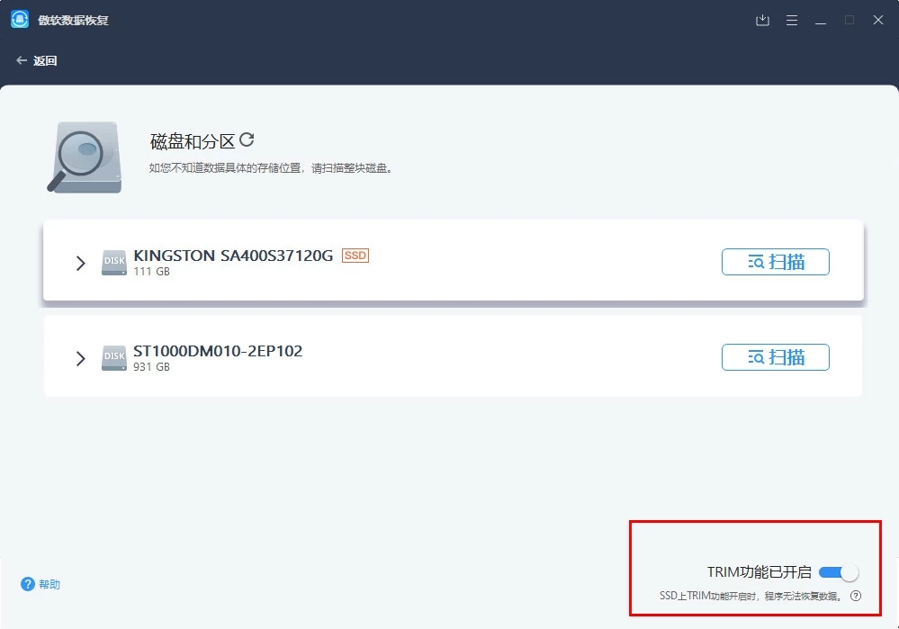 2、另外,您也可以打开傲软数据后,通过单击“ 找不到扫描位置 ” 从傲软数据恢复中轻松检查TRIM是开还是关。