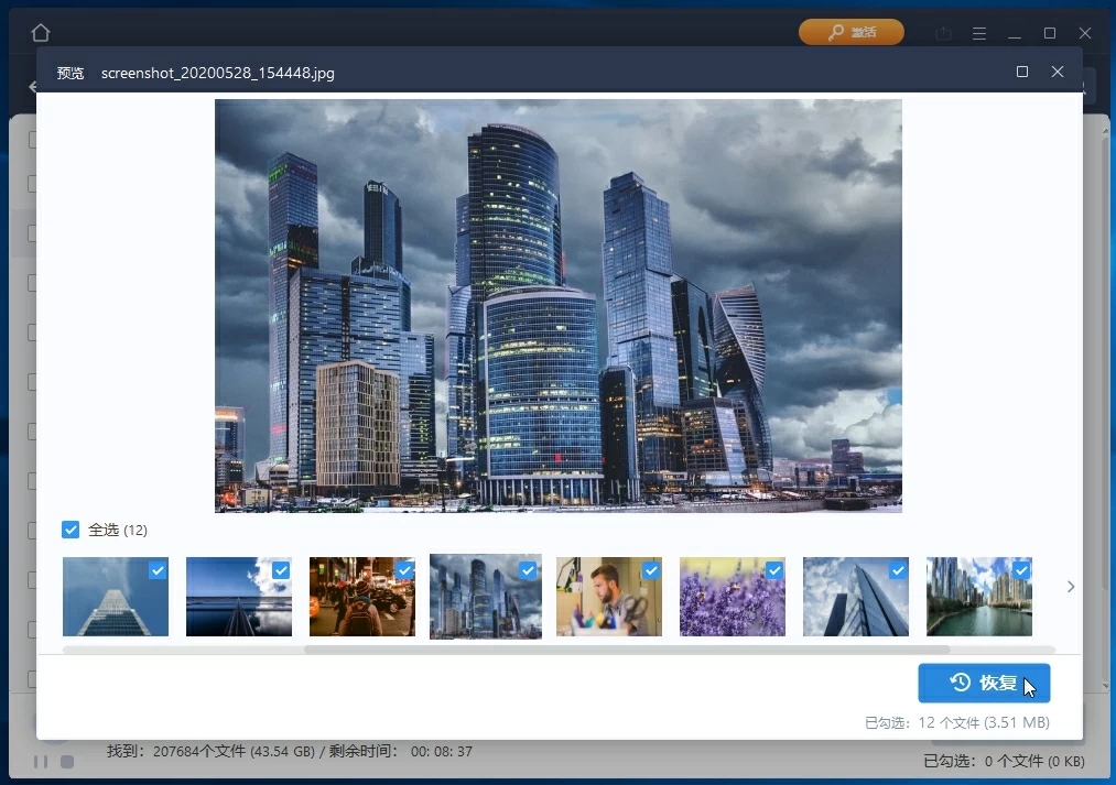 1、完成查找和预览后,勾选所需恢复的文件,点击『恢复』按钮可将您丢失的文件恢复到您的计算机或存储设备中。