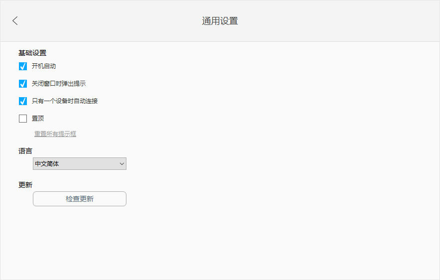 2、点击通用设置按钮进入软件基础设置页面,该页面可以设置软件开机启动和软件显示语言。