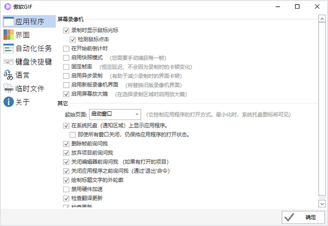 傲软GIF为用户提供了个性化的选项设置,在“选项”面板,你可以自定义傲软GIF应用程序相关权限,也可以设置软件的外观、快捷键、语言,以及临时文件存储目录等。