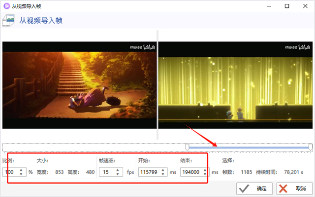 2、以导入为例,选择“媒体或项目”,上传一段视频,进入“从视频导入帧”窗口。在此窗口,你可以设定图像大小(比例),帧速率以及截取视频开始与结束时间,然后点击“确定”按钮,进入编辑器界面。