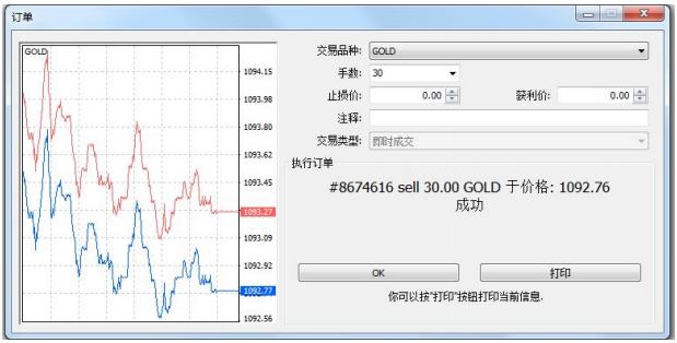 4、系统完成建仓指令后,窗口便会显示该张订单的详细数据。点击“OK”即可关闭窗口。