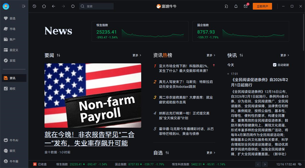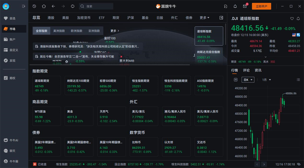 富途牛牛电脑版是一个功能强大的股票交易软件,特别适合想投资港股、美股等多市场的用户。它不仅提供实时行情,还能通过选股器和AI助手帮你分析市场趋势,方便你做出投资决策。我挺喜欢它的界面设计,操作起来很顺手,而且资讯更新也很快,能及时掌握市场动态。