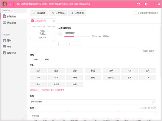 想要将自己的作品投稿到哔哩哔哩中,可是不知道怎么弄?您需要哔哩哔哩投稿工具,这是由bilibili官方为广大Up主们所提供的电脑版视频上传工具,又叫做bilibili投稿工具,在该软件中不仅可以上传自己的作品到bilibili网站中,还可以这里进行视频剪辑、视频压制、添加字幕等操作,非常的便捷实用,并支持批量上传自己的视频作品。而且投稿时可自定义选择类型、分区、标题、标签等信息内容,十分方便,另外如果当突然断网、电脑崩溃、意外退出等情况中止了上传也没关系,哔哩哔哩投稿工具会自动为用户保存数据,下次启动可继续上传,欢迎有需要的用户们免费下载体验。