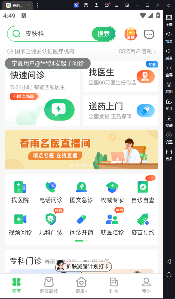 随着安卓系统的火爆,一夜之间几乎所有的电脑版软件都推出了安卓版本,以便更好的为广大手机用户服务。春雨医生电脑版正是借助于模拟器运行一款健康咨询软件,该软件拥有10000名医生在线,能够快速响应问题,帮助用户解决常见的医学健康问题,从而全方位守护用户的健康。