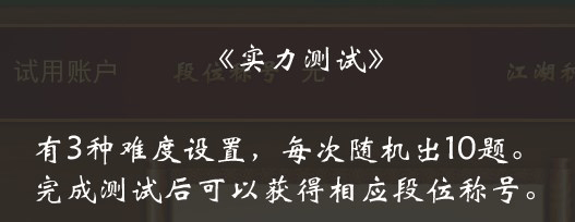 7、试用账户《实力测试》,有3种难度设置,每次随机出10题。完成测试后可以获得相应段位称号