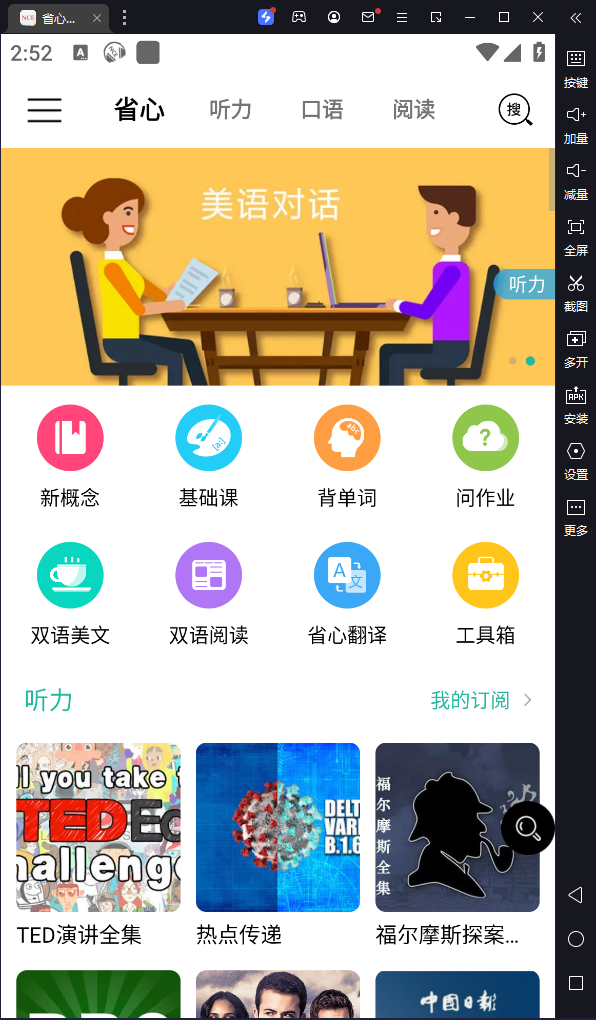 省心英语电脑版是一款基于安卓模拟器打造的英语学习神器,由于主打新概念英语学习,也称之为:省心新概念英语,或者是省心英语新概念NCE。其专为学生和职场人员打造,同步欧美先进教学理念,涵盖听力、口语、阅读、写作等全方位学习模块,为用户营造一个纯英文学习环境。软件特色功能丰富,支持屏幕取词、聊天机器人互动,提供音标、语法、口语练习等多样化学习素材。用户可畅享TED演讲、VOA广播等听力材料,通过双语美文、新闻速递提升阅读能力。