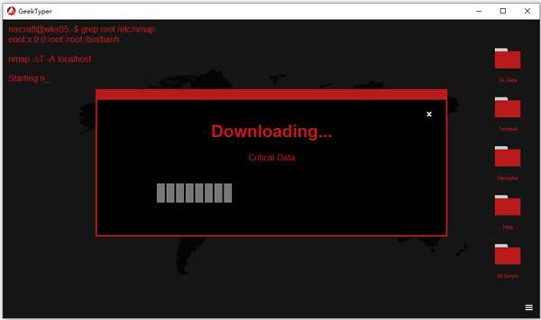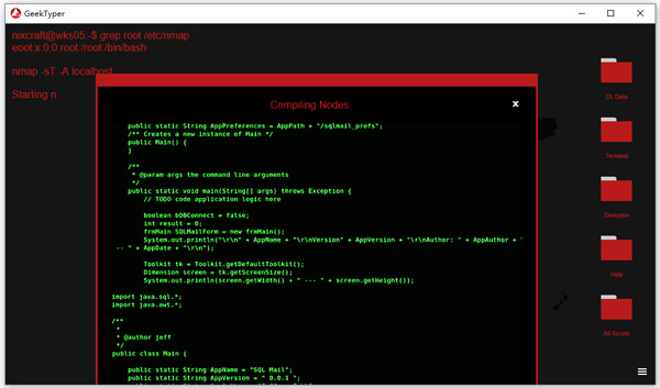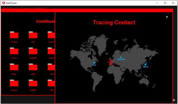 geektyper黑客模拟器电脑版是一款非常有趣的黑客模拟软件,能让你模仿黑客的代码输入、窗口调出以及资料窃取等电脑操作过程,虽然并没有什么实质功能,但能帮助你在朋友面前装装逼。用户只管拼命打字,软件就会弹出各种规矩的程序编码,就像黑客帝国的效果一样,再加入小键盘的各种特效,让你就像黑客绝世高手。