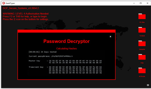 8、点击decryptor解密器文件,会出现一个解码界面,模拟一个黑客正在破解密码的场景。