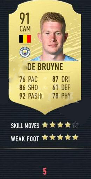 能力值91,外号丁丁的德布劳内总是在不经意间闪耀全场,无数次半场附近的长传直接洞穿对手的防线,固若金汤的防线在丁丁的精确制导下瞬间土崩瓦解,在FIFA20的AI强化下,丁丁的长传无疑能发挥更大的威力。