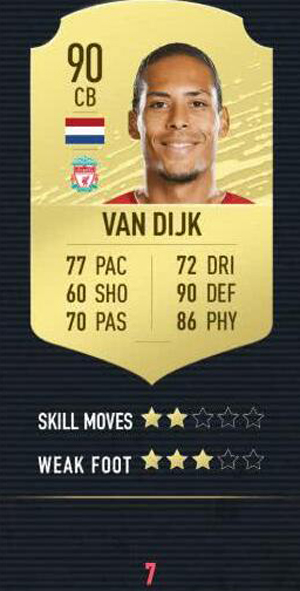 能力值90,新科金球奖得主,2018-2019赛季欧冠冠军利物浦的主力后卫,无数的进攻在范戴克身前戛然而止,出色的身体对抗以及拦截技术,让他成为无数进攻球员的噩梦,金球奖可以说是实至名归。