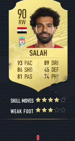 能力值90,如果利物浦的防守靠范戴克的话,那么进攻核心就是萨拉赫的,在17-18赛季欧冠决赛与皇马对阵中受伤之后,萨拉赫沉迷了一段时间,但是好在赛季下半段终于有所复苏,并和队友们一起捧起欧冠奖杯。