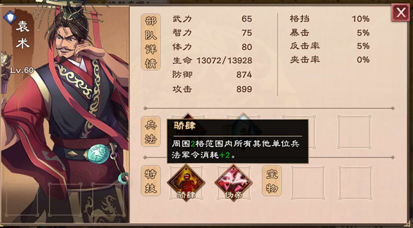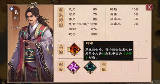 而伪帝形态下的袁术,拥有特技【骄肆】,周围2格所有其他单位兵法军令消耗+2。特技【伪帝】,能够在回合结束时周围2格所有其他单位士气-1。对面再也不用担心士气和兵法太多用不完了。