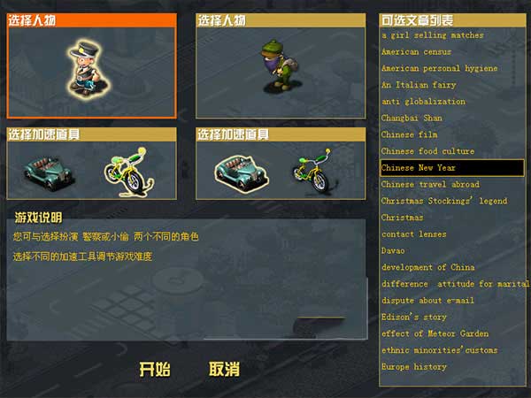 用户和电脑玩,用户可以选择游戏人物警察或小偷,还可以设置加速工具,是小汽车还是自行车。