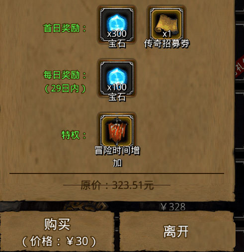 充值道具,一次充得越多性价比越高,最高是648换3万宝石,性价比接近1:50,最低是6元换150宝石,性价比为1:25。30元月卡,即坩埚会产出300+100*29=3200的宝石,性价比极高,还会增加36小时每日的冒险时长。新手入门阶段每个档位还会赠送一些物资用于起步帮助。